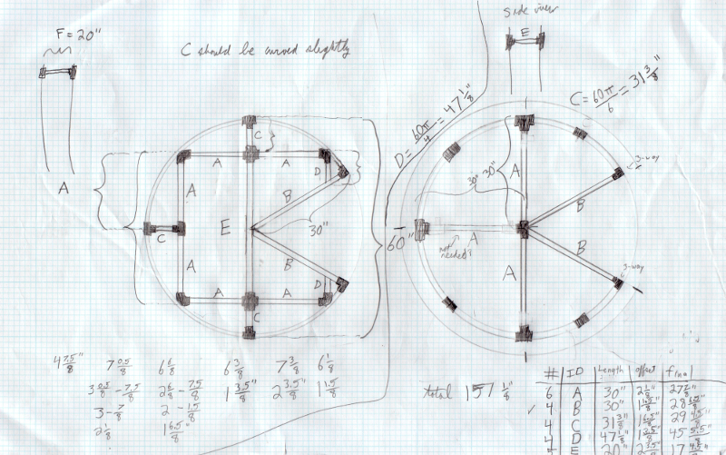 Keep in mind that the numbers in the bottom right are a bit mixed up. The A, B, C, E numbers apply to the lengths of the parts in the right diagram. There is no D in the right diagram. That applies only to the left diagram (I accidentally left it in when copying numbers over). The lengths for the parts on the left aren't labelled because I did the calculations and wrote down the results on another paper.